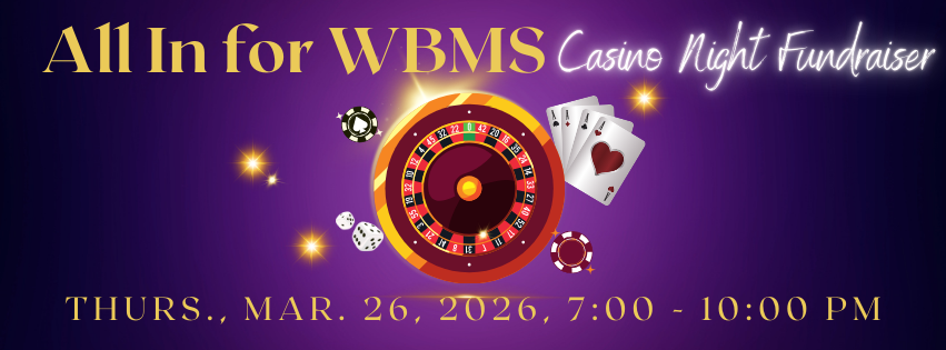 Join us for our third annual Casino Night Fundraiser “All in for WBMS!” on Thursday, March 26, 7:00 – 10:00 PM at Catharine Clark Gallery. Join us for an evening of games, giving, and great company—all in support of our Warriors. Try your luck, enjoy delicious bites, and help make a difference! This year, we’re raising funds to support our new Outdoor Education field trips so ALL students can attend.
